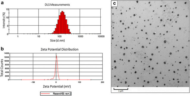 DLS measurements to determine the size of the liposomes. The liposomes are approximately 129 nm in diameter with a polydispersion index of 0.05. b Zeta-potential measurements of the liposomes. Z = 0.3 mV.